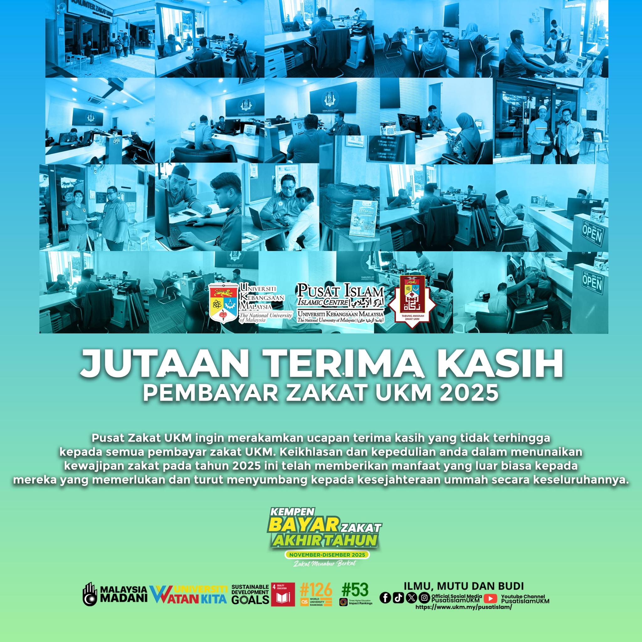 Jutaan terima kasih diucapkan kepada semua pembayar zakat di Universiti Kebangsaan Malaysia (UKM).